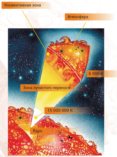 Вокруг ядра – зона лучистого переноса энергии, она распространяется путём поглощения и излучения веществом порций света – квантов. Плотность, температура и давление уменьшаются по мере удаления от ядра, и в этом же направлении идёт поток энергии. В целом процесс этот крайне медленный. Чтобы квантам добраться от центра Солнца до фотосферы, необходимы многие тысячи лет: ведь, переизлучаясь, кванты всё время меняют направление, почти столь же часто двигаясь назад, как и вперёд. Так что если бы «печка» внутри Солнца вдруг погасла, то мы узнали бы об этом только миллионы лет спустя.