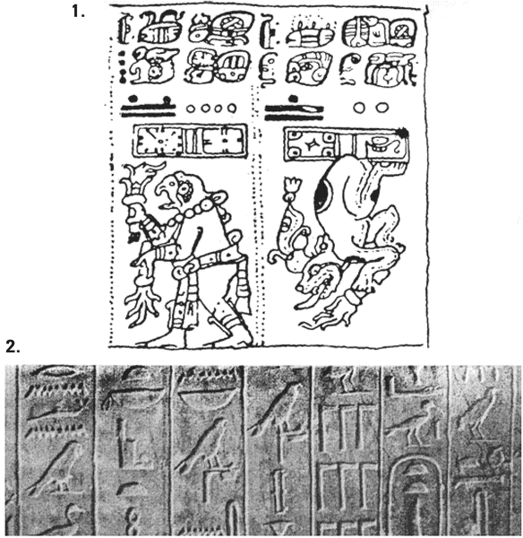 Учёные сопоставляют памятники культуры древних народов, например древнеегипетский папирус «Анни» (2) из «Книги Мёртвых» и лист из Кодекса «Дрезденсис» народов майя (1)