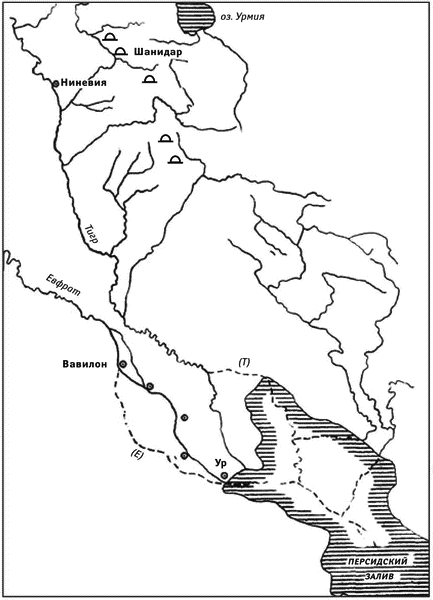 На схеме Месопотамии IV тыс. до н.э. значками оказаны пещеры (в том числе и Шанидар), пунктиром – современные русла рек Тигр и Евфрат