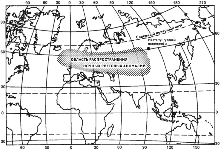 Аномально светлые ночи наблюдались на территории Евразии к западу от места катастрофы