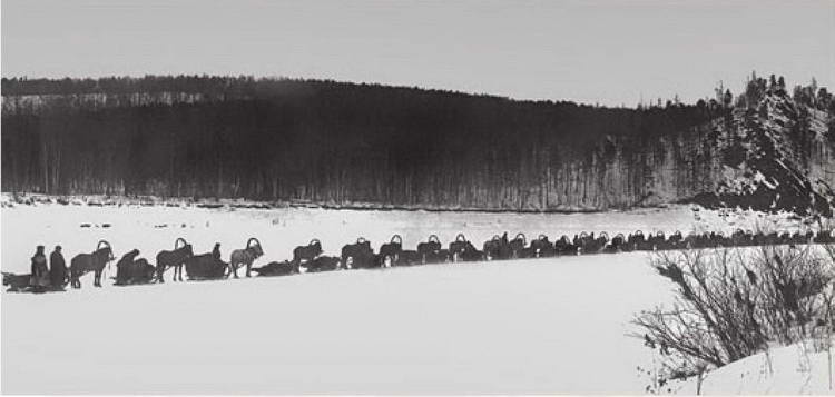 Обоз экспедиции 1929 г. продвигается по замёрзшему руслу реки Подкаменная Тунгуска