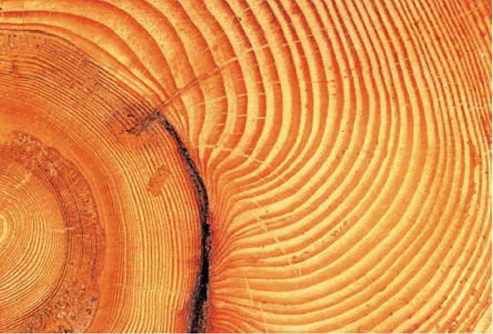 На спиле 180-летней лиственницы по толщине колец хорошо заметен ускоренный прирост древесины после катастрофы 1908 г.