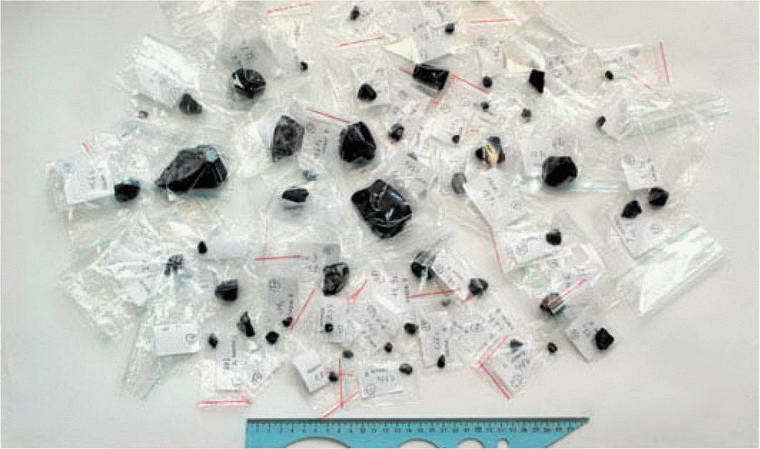 Наряду с выявлением рассеянного космического вещества продолжается поиск тектитов. Тектиты («тектос» по-гречески – оплавленный) – оплавленные тёмно-серого и тёмно-зелёного цвета полупрозрачные стекловидные округлого вида «камешки». Их природа до сих пор остается загадкой. Тектиты находят в некоторых местах земного шара.