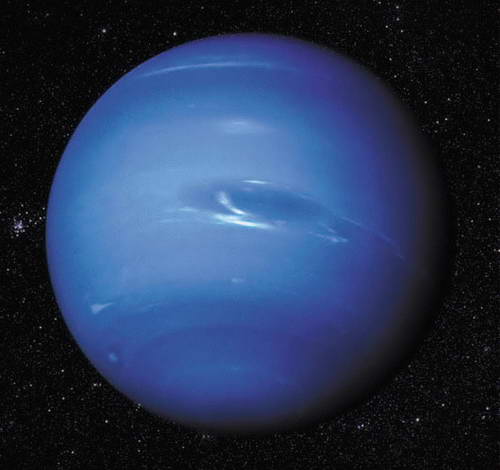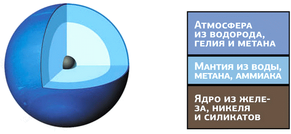 Атмосфера Нептуна состоит в основном из водорода (80%), гелия (19%) и метана (1%), окрашивающего её в голубой цвет. На видимой поверхности Нептуна наблюдаются облачные полосы, а также тёмные и светлые пятна – вихри. Кроме того, на южном полюсе планеты обнаружена горячая область, температура которой на 10 К выше, чем в среднем по планете. Нептун излучает в космос в 2,6 раза больше энергии, чем получает от Солнца, и, следовательно, имеет внутренний источник тепла неизвестной природы.