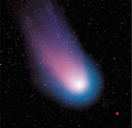 Комета (от др.-греч. волосатый, косматый) – небольшое небесное тело, обращающееся вокруг Солнца и имеющее туманный вид. Когда комета приближается к Солнцу, вокруг её ядра образуется облако из пыли и газа, которое называется комой. Вместе ядро и кома образуют «голову» кометы. Чем ближе к Солнцу – тем сильнее растёт «голова» кометы, а иногда у неё появляется газовый и пылевой «хвост».