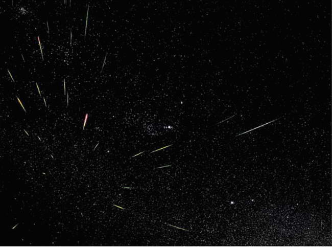 В пространстве, окружающем нашу планету, движется множество твёрдых тел разных размеров – от пылинок до глыб поперечником в десятки и сотни метров. Чем больше размер тел, тем реже они встречаются. Поэтому пылинки сталкиваются с Землёй ежедневно и ежечасно, а глыбы – раз в сотни и даже тысячи лет. Тело массой в доли грамма, вторгаясь в земную атмосферу с огромной скоростью (десятки километров в секунду), раскаляется от трения о воздух и целиком сгорает на высоте 80–100 км. В этот момент наблюдатель на Земле видит метеор. Уже давно люди заметили, что в отдельные ночи появлялось очень много метеоров. Это были настоящие звездопады, повергавшие очевидцев в изумление, а порой и в ужас. В ноябре 1799 г. такой звездопад наблюдал в Южной Америке известный немецкий путешественник и учёный Александр Гумбольдт. Он обратил внимание на то, что метеоры двигались по небу не как попало, а словно бы истекали из одной области на небе, т. е. обратные продолжения этих огненных стрел пересекались в одной точке. Эту точку стали именовать радиантом метеорного потока.