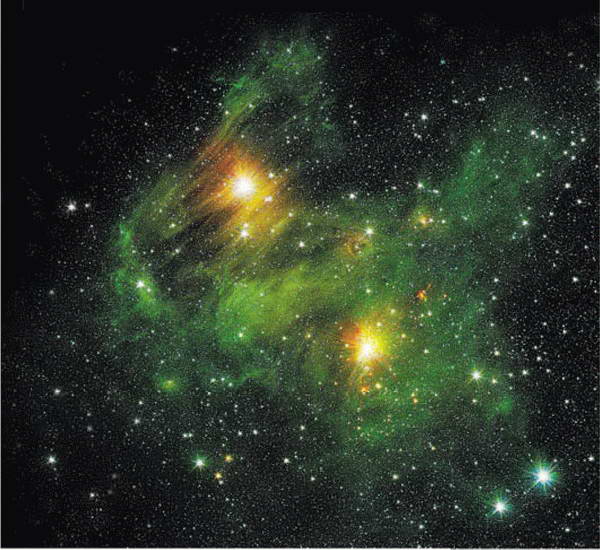 Две яркие молодые звезды в зелёной туманности