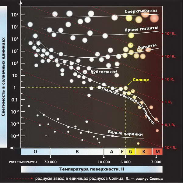 В 1905–1907 гг. датский астроном Эйнар Герцшпрунг обнаружил, что голубые звёзды имеют самую высокую яркость, а среди красных звёзд можно выделить слабые и сравнительно яркие, т.е. что цвет и светимость звёзд каким-то образом соотносятся друг с другом. А в 1913 г. американский астроном Генри Рассел сопоставил светимость различных звёзд с их спектральными классами. На диаграмму спектр – светимость, которая теперь называется диаграммой Герцшпрунга – Рассела, он нанёс все звёзды с известными в то время расстояниями (не зная расстояния, невозможно оценить светимость звезды).