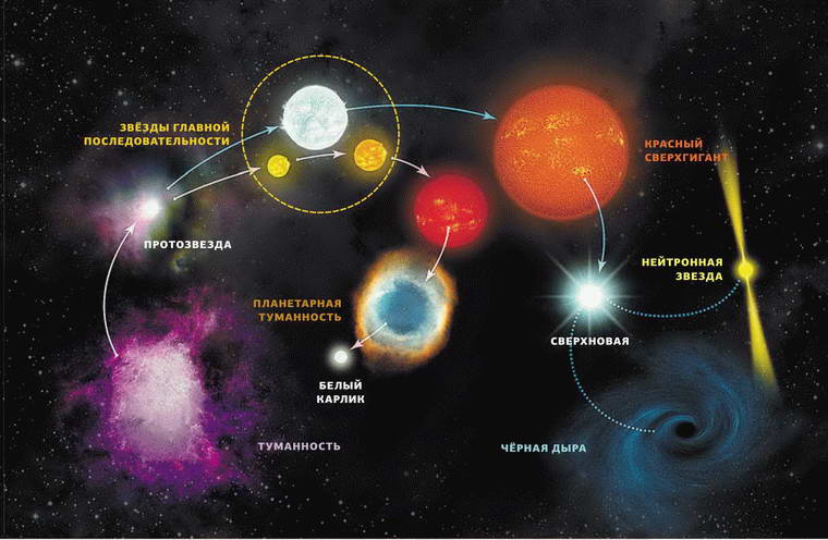 На схеме оказано, как из протозвёздного вещества появляется звезда, эволюционирует и может со временем превратиться в белого карлика, нейтронную звезду или в чёрную дыру
