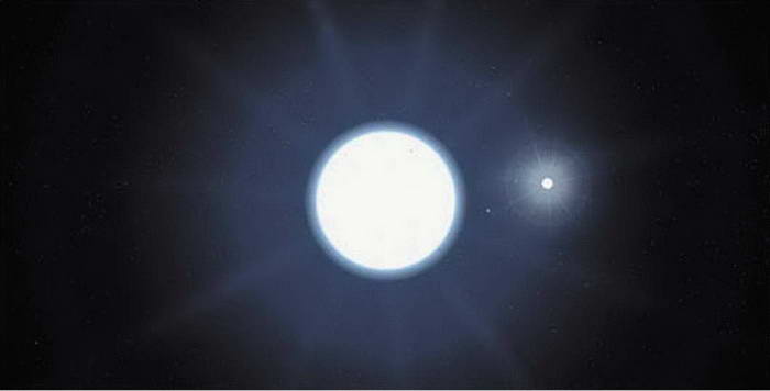 Двойная звезда Сириус: Сириус А (слева) – ближайшая к нам и ярчайшая звезда ночного неба; Сириус В (справа)