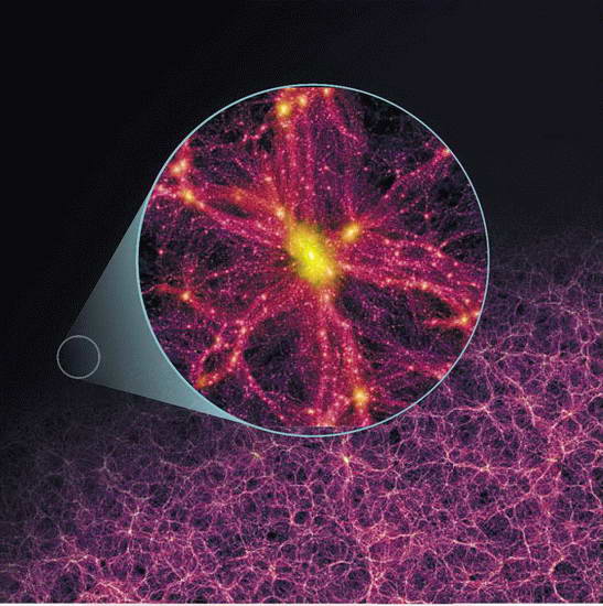 Компьютерная модель, показывающая структуру Вселенной. Жёлтым обозначена материя, чёрным – пустота, фиолетовым – наблюдаемая лишь косвенно загадочная тёмная материя. Каждая жёлтая точка – одна галактика, пятна покрупнее – скопления и сверхскопления галактик