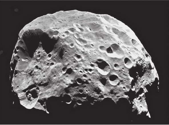 Следы древних космических ударов во множестве сохранились и на лунах Сатурна. Начнём с относительно близкого к Сатурну крупного спутника Мимас. Облик этой «израненной» луны впечатляет. Особенно поражает кратер Гершель. Взрыв «космической бомбы» вырыл воронку поперечником 130 км и глубиной 10 км! Поперечник кратера составляет около трети диаметра Мимаса. По дну кратера проходит неглубокая трещина, которая прослеживается за пределами кольца. Нельзя исключить, что разлом коры произошёл в результате того страшного удара. Столкновение с астероидом породило мощные ударные волны, которые прокатывались по всему телу Мимаса и фокусировались в точке, противоположной месту взрыва. Если бы столкнувшееся с Мимасом тело обладало несколько большей массой или более высокой скоростью, оно бы разбило этот спутник на куски.