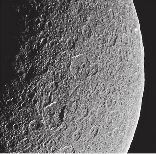 На спутнике Сатурна Тефии (его диаметр 1060 км) отчетливо видны многочисленные следы бомбардировки астероидами и кометами. На одном полушарии насчитывается до десятка очень больших кратеров. Кратер Одиссей больше всех других на Тефии (его размеры близки к рекордным в Солнечной системе – диаметр кратера Одиссея равен 400 км, т.е. в три с лишним раза больше поперечника кратера Гершель). Не случайно второе название кратера – Великая Котловина. Кратер имеет сложную структуру: ступенчатый кольцевой вал, обширное срединное поднятие и несколько вытянутую центральную горку. Это свидетельствует о длительном процессе формирования гигантского кольцевого образования. О древности катастрофы, которая могла привести к разрушению Тефии, судят по обилию молодых кратеров меньшего размера внутри вала Одиссея. Судя по тому, что плотность Тефии близка к плотности замёрзшей воды, сегодня этот спутник Сатурна представляет собой ледяной шар. То, что Тефия при этой катастрофе не разрушилась, говорит о том, что в те давние времена она не была полностью заледенелым телом.