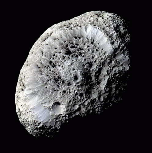 Необычен и удивителен облик Гипериона – внешнего соседа Титана. Он напоминает губку неправильной формы размерами 360x226 км. На очень подробном изображении Гипериона, переданном аппаратом «Кассини», вырисовывается огромная кольцевая структура. Она занимает большую часть этого странного спутника Сатурна. Левая половина кругового склона, ограничивающего дно впадины, имеет лучшую сохранность. Правая часть, по-видимому, разрушена позднейшими ударами из космоса. Изучение космических снимков показало, что поверхность Гипериона не только «гуще» усеяна кратерами, чем другие спутники Сатурна, но кратеры эти ещё значительно глубже. Дно многих из них покрыто неизвестным материалом. Внешний покров Гипериона своим видом немного напоминает пчелиные соты. Плотность Гипериона очень мала, что можно объяснить пористой структурой пород или наличием в недрах крупных пустот.