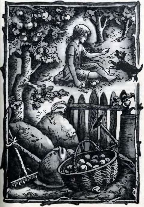 Влітку тут темно. Ніяк не може пробитися сонце. Зрідка просіюється його проміння, мерехтить, наче беззвучно просіюється золоте зерно. А біла береза вся облита сонцем. І тоді в старому садку падають перші яблука. Білі папіровки. І рябенькі, тому що посмуговані червіньковими смужками. Їх усього дві яблуні – папіровка і та, що родить рябенькі.