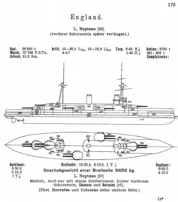 Торпедное вооружение. На момент готовности "Нептун" имел три подводных 18-дюймовых (457-мм) торпедных аппарата (конструкции компании "Армстронг"), размещенных в трех торпедных отсеках-два бортовых, расположенных на трюмной палубе между наружной поверхностью носового барбета и помещением машинного отделения носового шпиля и одного кормового (после Ютландского сражения был снят) с общим боезапасом 18 торпед.