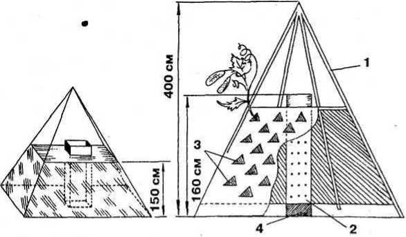 Рис. 10. Вертикальная грядка – «пирамидка»: 1 —трубы основы каркаса; 2 – питатель; 3 – треугольные отверстия для рассады; 4—пробка