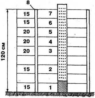 1 – ветки, бытовые отходы; 2 – опилки, солома, сено; 3 – торф, кочки; 4 – трава, ботва; 5 – навоз; 6 – листва; 7 – сапропель, компост; 8 – дернина