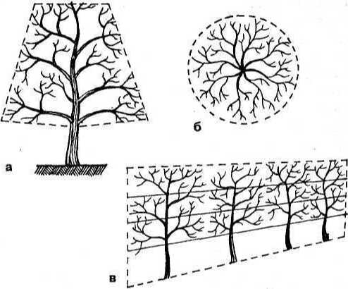 Очень важный момент при формировании кроны – обрезка и пригибание ветвей. Возьмём, например, яблоню. На небольшом участке лучше выращивать карликовые и полукарликовые деревья, которые требуют меньше места, питательных веществ и не затеняют другие растения. Путём пригибания, подвязки или обрезки легко придать яблоне форму пальметты (рис. 16 а, б) или плоской садовой стенки (рис. 16, в). Таким образом размещаются сливы, вишни, персики, груши, малина, смородина, крыжовник.