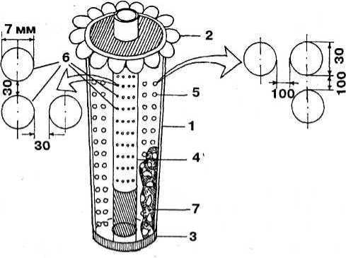 1 – каркас из труб, обтянутый плёнкой; 2 – верхнее кольцо; 3 – нижнее кольцо с глиняным дном; 4 – труба–питатель из пластика – 1,5 дюйма с отверстиями по поясу диаметром 7 мм; 5 – отверстия 30-40 мм в плёнке для рассады; 6 – отверстия в питателе и расстояния между ними; 7 – субстрат