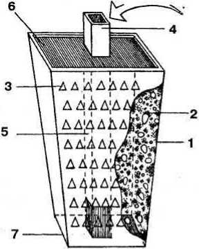 1 – каркас; 2 – субстрат; 3 – отверстия для рассады; 4 – питатель; 5 – отверстия в питателе (7 мм) для истока (капельного полива) воды; 6 – верхний квадрат; 7 – нижний квадрат