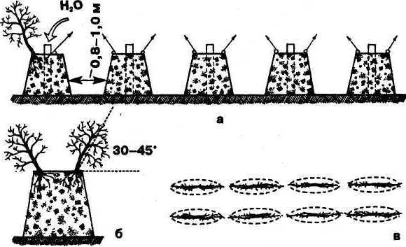 Рис. 23. Рабатка – «обойма»: а – вид сбоку; б – угол посадки саженца; в – вид сверху на ряды