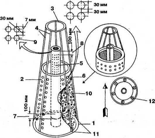 Для цилиндрической грядки–рабатки (рис. 24) заготовьте 5 прутьев диаметром 10 мм и длиной 2 метра, а также сварите нижний круг диаметром 75 см и верхний круг диаметром 37, 5 см. Сварите электрогазосваркой всю конструкцию в виде цилиндра. На высоте 150 см обтяните её гибким пластиком с отверстиями для выращивания рассады (30x30 мм) или толстой плёнкой, или крепкой мешковиной, или жестью. Отдельно изготовьте трубу–питатель из пластика, полихлорвинила, железа диаметром 1,5 дюйма. Просверлите в ней отверстия диаметром 7 мм. На поясе должно быть не менее 4 отверстий. Между поясами оставьте расстояние 30 мм. Питатель снизу заглушается глиноцементной или деревянной пробкой и устанавливается строго в центре рабатки на глиногипсовом или глиноцементом растворе. Весь питатель оберните тонким поролоном, чтобы не засорялись отверстия при поливе. Когда раствор затвердеет, прикрепите верх питателя к двум прутьям хомутом.