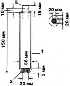 1 – корпус из трубы или квадрата; 2 – заточка – рабочая часть, отверстие 30 мм; 3 – опорный квадрат (для нанесения ударов молотком)