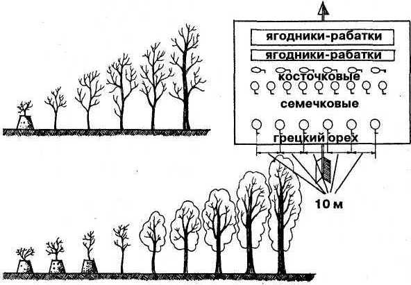 Теперь рассмотрим схему размещения деревьев по каждой культуре. Расстояние в ряду между деревьями: орех– 10 метров, груша – 6 метров, яблоня – 4-5 метров, вишня, слива – 3-4 метра, смородина, малина, крыжовник – 0,5-1 метр, земляника – 0,20-0,25 метра. Расстояние между рядами интенсивного сада нужно выдержать по такой схеме: орех – груша – 5 метров; груша – яблоня – 3-4 метра; яблоня – вишня, слива – 2-3 метра; вишня – слива, смородина (малина), крыжовник– 1-1,5 метра.