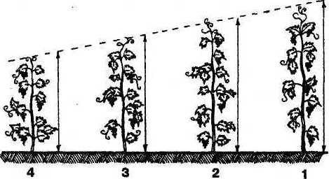 1 – вертикальный кордон с высоким штамбом; 2,3,4 – вертикальный кордон с полувысоким, средним и низким штамбами