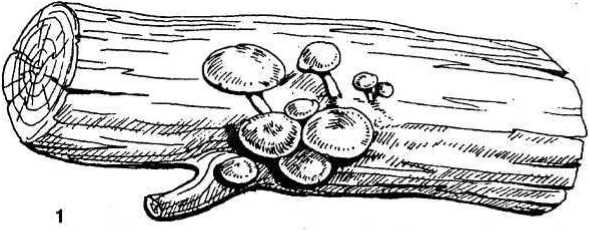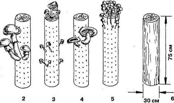 1 – часть ствола дерева (сосна, дуб, граб, берёза) с летним опёнком; 2 – гриб шиитаке (сиитаке); 3 – гриб–кольцевик; 4 – гриб вольвариелла; 5 – зимний гриб; 6 – заготовка для изготовления грибной рабатки