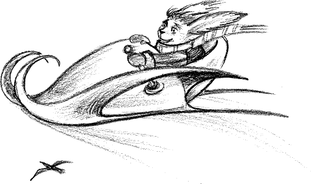Как-то, испытывая своё новое изобретение – сани с вертикальным взлётом, Механик пролетал над Маськиным двором. Он сразу заметил Шушутку, катающегося на самокатике, и спустился для того, чтобы изучить это уникальное средство передвижения.
