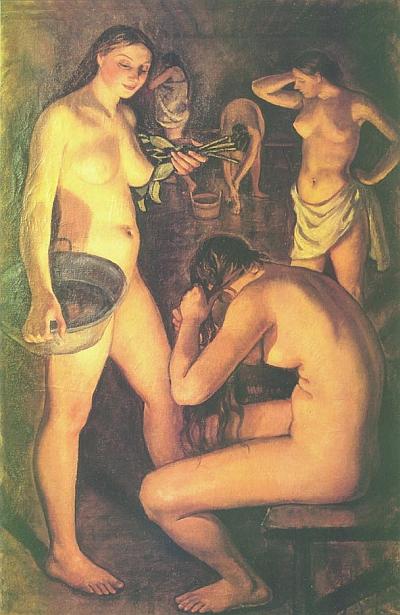 «В картине “Баня” осознание человеком себя, своего тела, своей физической природы проходит через изображение чрезвычайно важного ритуала русской крестьянской жизни. Отсюда целомудренная красота и душевная чистота, которыми пронизано изображение обнаженного тела. Картина лишена сиюминутной конкретной сюжетности, в ней есть обобщенность. Фигуры замерли в достаточно условных позах. И это отсутствие движения приближает ее к панно».