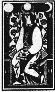 На карте изображена женская фигура – Дева, или Исида, которая обозначает механизм интуиции. Дева сидит. Это означает спокойное состояние сознания. В руках у Девы – книга (свиток). Под этим свитком подразумевается Тора, она же Библия, а также разные священные книги, в которых дано описание мира, описание Договора. Там и изложена формализованная база данных.