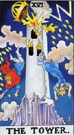 Начинаем путешествие вглубь мира мертвых. Работаем с 16-м арканом. Вспомните, что на карте изображена стоящая на скале башня, из которой выпадают две фигуры: одна с деньгами, другая в короне; а сверху бьет молния. Это карта обратного удара.