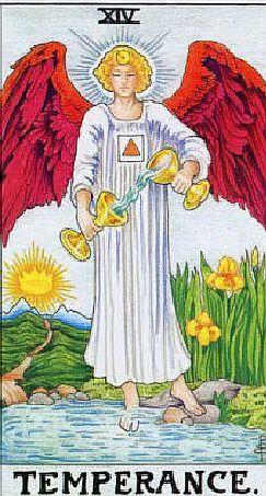 Начинаем проводить 14-й аркан в обратном круге на уровне Вишудха-чакры. На карте изображен Ангел, в руках у него два кувшина: золотой и серебряный. Ангел переливает воду из одного кувшина в другой – превращает серебро в золото. Карта 14-го аркана – символ алхимии.
