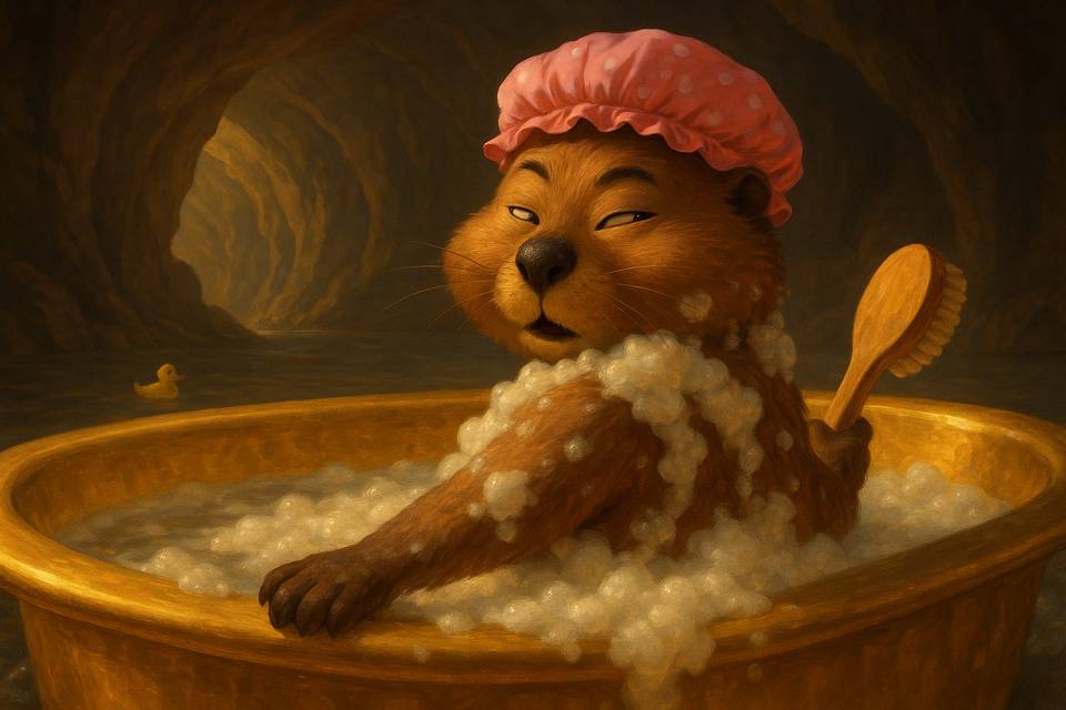 Я подошёл к этой ванне и увидел в ней Бобэра. Тот облокотился одной лапкой о борт ванны, а в другой держал щётку, которой чесал свою спину. Что более странно – он был весь в пене, а на его голове виднелась розовая шапочка для душа.