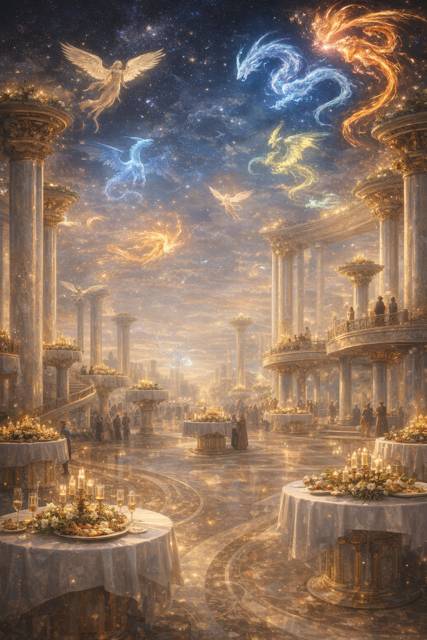 Весь торжественный зал был усеян широкими мраморными столбами, на вершинах которых были установлены столики и закуски. Некоторые столбы были всего несколько метров в высоту и имели лестницы, другие были выше – туда могут забраться только те маги, которые умеют летать.