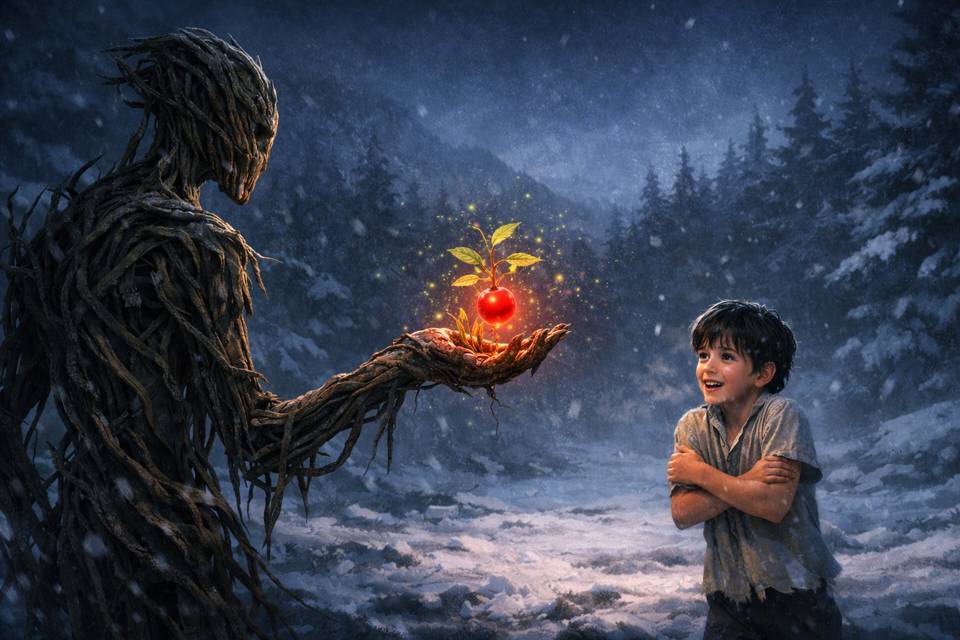 Росток вернулся в палец древесной куклы, и она повернула ладонь вверх. Её конечность принялась цвести, из середины ладони вырос стебель, из которого вырвались несколько листочков. Не прошло и пары минут, как на вершине этого растения образовался алый плод, похожий на вишню, – только очевидно магический, так как он слабо мерцал.