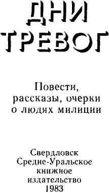 Многогранна деятельность милиции: борьба с детской безнадзорностью, работа ОБХСС, уголовный розыск, служба ГАИ… Об этом многообразии и рассказывают в сборнике «Дни тревог» писатели и журналисты. На страницах книги лицом к лицу встают преступник с его ущербной моралью и работники различных служб милиции, защищающие достоинство и интересы советского человека, человека с моралью высокой – социалистической.