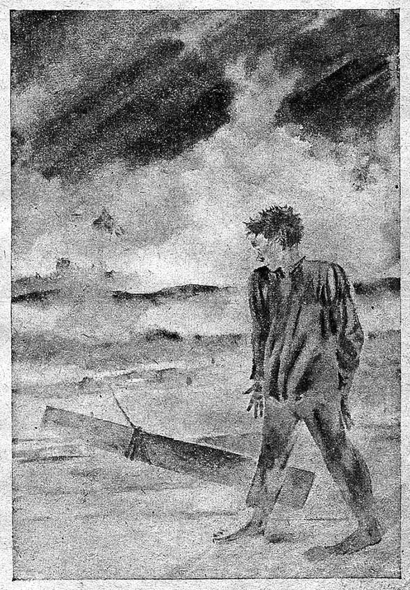 Наконец я выкарабкался. Глянул на судно: стоит и парусами на зыби колышет, как птица подстреленная. А я так рад был, что на земле, и мне все казалось, что еще качает, что земля подо мной ходит. Я отвязался от доски и стал тянуть веревку. Знак как раз тут же был: громадный столб с укосинами, и наверху что-то наворочено вроде бочки. Я взял веревку на плечи и пошел. Ноги в песке вязнут, и во рту песок, и в глаза набило, и низом метет песком. Еле веревку вытащил… Смотрю, уж кончилась тонкая веревка, и канат пошел толстый. Я его запутал, как умел, за знак, под самый корень, и лег на песок – весь дух из меня вон, пока я тянул.