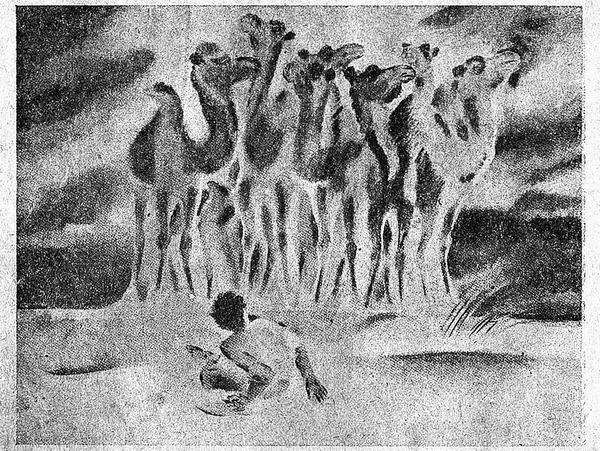 А вдали я увидел, будто стадо. Пошел туда – ну, вот, люди, пастухи там должны быть. Боялся только, что собаки выскочат. Я перестал бежать, но шел со всех сил. Волочу ноги по песку. Когда стал подходить, вижу – это верблюды. Я совсем близко подошел – ни одной собаки нет. И людей тоже.