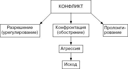 Конфликтная ситуация может благополучно разрешиться, если субъекты конфликта находят общий базис для урегулирования вопроса. Конфликтная ситуация может растягиваться на неопределенно долгое время и принимать различные формы, но не разрешаться по существу. И, наконец, конфликтная ситуация может перерастать в конфронтацию с переходом в агрессивную стадию разрешения конфликта.