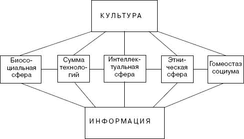На схеме 8 показаны основные блоки, формирующие пласт культуры современной цивилизации. Интегральным показателем культуры может служить объем информации, накопленной каждым из блоков, включая информацию различных взаимопереходов между содержанием блоков. При этом информация может служить как стабилизирующим, так и деструктивным началом для гомеостазиса всей системы.