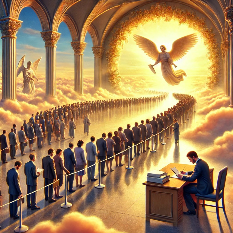 Передо мной простирался гигантский зал, полный извивающихся, как змеи, очередей. Люди, ангелы и даже какие-то полупрозрачные сущности стояли в длинных линиях, ведущих в неизвестность. В воздухе висел тихий гул: кто-то кашлял, кто-то шептался, кто-то нервно стучал ногой. Изредка раздавались отчаянные возгласы: