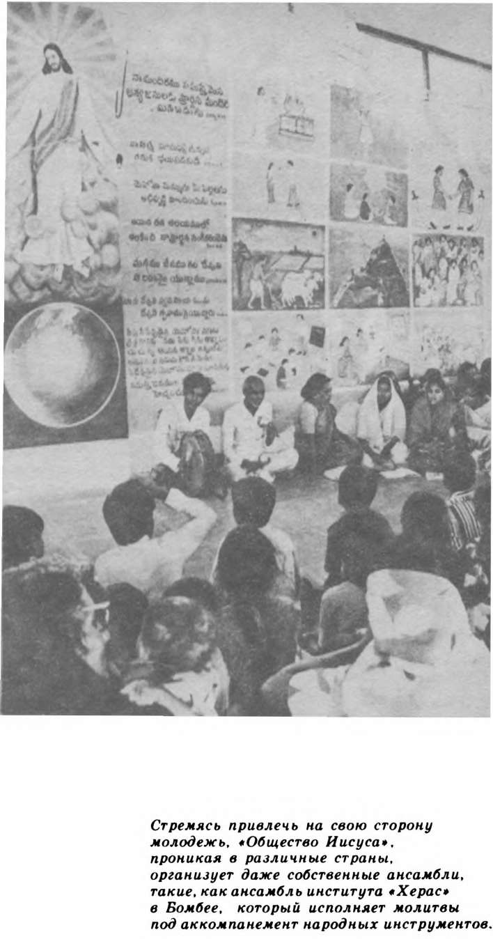 Именно в силу этих причин иезуиты заняты поисками новых способов налаживания контактов с молодым поколением и большое внимание уделяют внешкольной работе, занимаясь организацией досуга подростков и студентов, участвуя в их вечерах, спортивных, культурных и иных мероприятиях. Учащиеся иезуитских колледжей проникают в молодежные центры, где ведутся диспуты и беседы о смысле жизни, а также в студенческие общежития, в которых они развернули бурную деятельность по «спасению душ». Подстраиваясь под вкусы молодежи, иезуиты прибегают к явно нетрадиционным приемам, таким, например, как проведение дискотек или постановка рок-опер. Религиозная пропаганда проникает в молодые сердца постепенно, точно размеренными дозами.