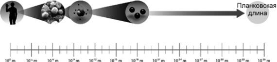 Рис. 4.1. Планковская длина, на которой сходятся гравитация и квантовая механика, примерно в 100 миллиардов миллиардов раз меньше, чем любая область, когда-либо исследованная экспериментально. На схеме каждое большое деление соответствует уменьшению размера в 1000 раз; благодаря этому данная схема целиком умещается на одной странице, что, однако, визуально снижает масштабность этого огромного диапазона. Для лучшего понимания укажем, что если увеличить атом до размеров наблюдаемой Вселенной, то планковская длина будет равна размерам обычного дерева