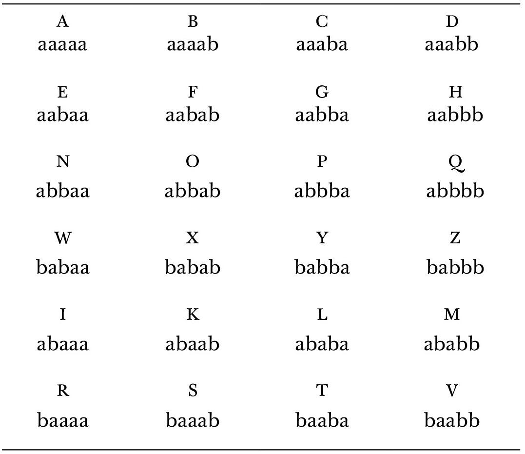 «Но чтобы помочь избежать вообще всякого подозрения, мы приведем еще одно средство, изобретенное нами в ранней юности, в бытность нашу в Париже; даже сейчас, как нам кажется, это изобретение не потеряло своего значения и не заслуживает забвения. Ибо оно представляет собой высшую ступень совершенства шифра, давая возможность выражать всё через всё (omnia per omnia). Единственным условием при этом оказывается то, что внутреннее письмо должно быть хотя бы в пять раз меньше внешнего; никаких других условий или ограничений не существует. Вот как это происходит. Прежде всего все буквы алфавита выражаются только двумя буквами путем их перестановки. Перестановки из двух букв по пяти позициям дадут нам тридцать два различных сочетания, что более чем достаточно для замещения двадцати четырех букв, из которых состоит наш алфавит. Вот пример такого алфавита».