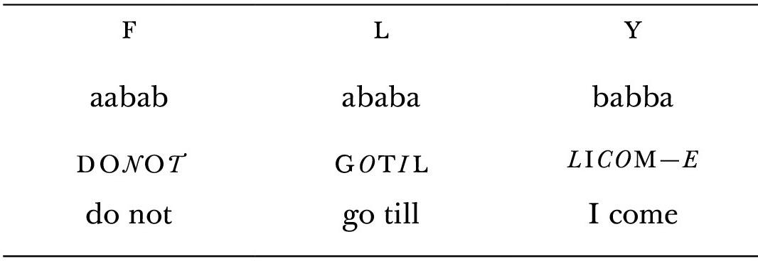 Затем, написав внутреннее письмо двухбуквенным алфавитом, нужно приложить к нему, буква к букве, внешнее письмо, написанное двойным алфавитом, и потом расшифровать. Пусть внешним письмом будет Do not go till I come («Оставайся на месте, пока я не приду»).