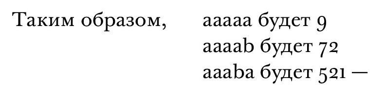 Другие цифры и их комбинации оставим исключительно для алфавита. Затем возьмем из них следующие пять (от 9 до 45) для обозначения гласных. Прочий алфавит следует в обычном порядке с использованием комбинаций вплоть до тройных, сперва – те, где в конце и начале стоят четные, дающие при сложении девятку, а когда они кончатся – остальные, с нечетными в начале и конце, дающие восьмерку.